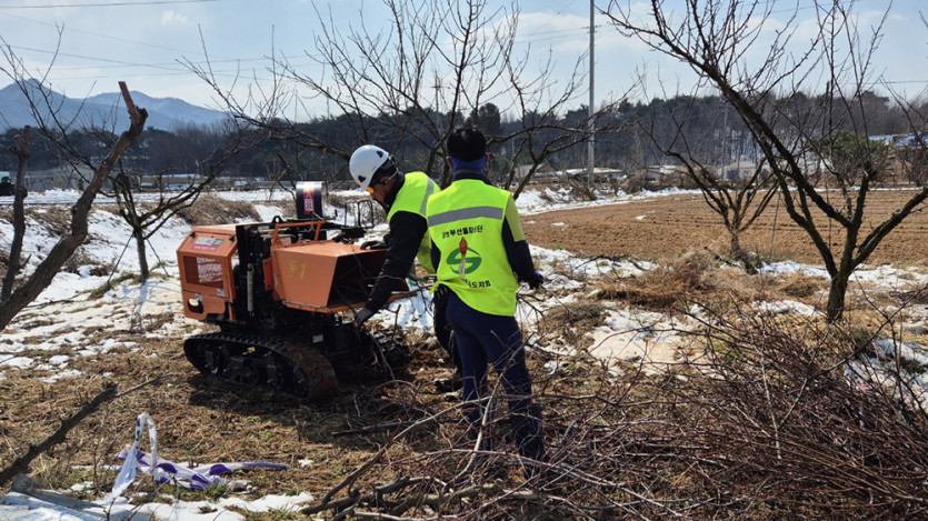 ◎ 사진 설명 : 지난 2월 영농 부산물 파쇄단이 농가를 찾아 영농 부산물 파쇄를 지원하는 모습